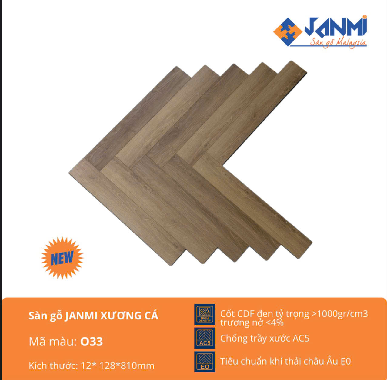 Sàn gỗ Janmi xương cá mã màu O33 là sự kết hợp hoàn hảo giữa vẻ đẹp mộc mạc của gỗ tự nhiên và công nghệ sản xuất hiện đại. Sản phẩm được nhập khẩu trực tiếp từ Malaysia, mang đến một giải pháp lát sàn cao cấp, độc đáo và bền đẹp cho mọi công trình.