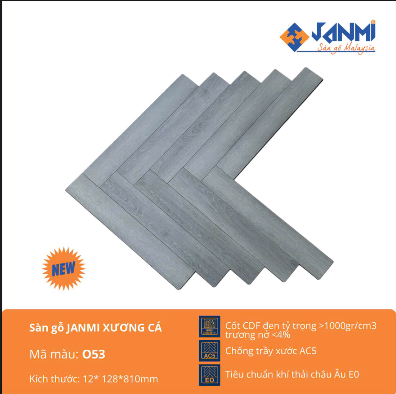 Không chỉ bền đẹp, sàn gỗ Janmi O53 còn rất an toàn cho sức khỏe người dùng và thân thiện với môi trường, đạt tiêu chuẩn khí thải E0 của châu Âu, mức phát thải formaldehyde gần như bằng không. Với gam màu xám xanh độc đáo và vân gỗ tinh tế, sản phẩm này dễ dàng phối hợp với nhiều phong cách nội thất, từ hiện đại, công nghiệp đến Scandinavian, kiến tạo nên một không gian sống đầy cá tính, sang trọng và khác biệt.